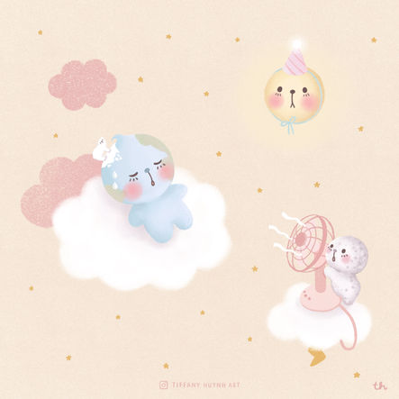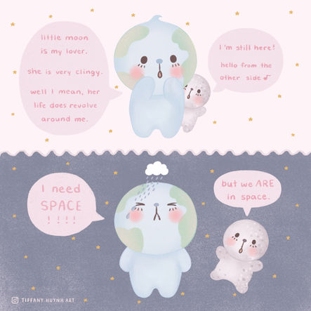 Earth Baby has a small wave of hair, a water body and animal friends that pop out from his face from time to time. He is also accompanied by his overly attached lover, Moonie.